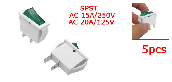 Item Name Rocker Switch Type On/Off(SPST) Voltage & Current AC 15A/250V, AC 20A/125V Size 31 x 14 x 37mm / 1.2" x 0.6" x 1.5"(L*W*H) Mount Hole Diameter 28 x 10mm / 1.1" x 0.39"(L*W) Color White, Green Material Plastic & Metal Total Weight 23g Package Content 10 x Rocker Switch - Reviews