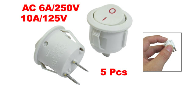 Details5 Pcs 2 Pin SPST On/Off Round Rocker Switch AC 6A/250V 10A/125V Gray  Item Name Rocker Switch Type On/Off(SPST) Voltage & Current AC 6A/250V 10A/125V Size 23 x 28mm / 0.9" x 1.1"(D*H) Mount Hole Size 19 x 11mm / 0.75" x 0.43"(L*W) Color Gray, Red Material Plastic & Metal Total Weight 18g Package Content 5 x Rocker Switch