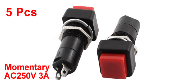 Product Name Push Button Switch Action Type Momentary Rated Voltage & Current AC250V 3A Pin Number 2 Contact Type SPST Thread Dia 11mm/0.43" Button Head Diameter 10 x 10mm / 0.4" x 0.4"(L*W) Total Size 14 x 40mm / 0.5'' x 1.6''(Max.D*H) External Material Plastic, Metal Color Red,Black Net Weight 24g Package Content 5 x Push Button Switches - Reviews