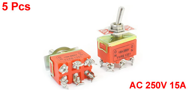 5 Pcs 2-Position ON-ON DPDT Self-Locking Toggle Switch AC 250V 15A