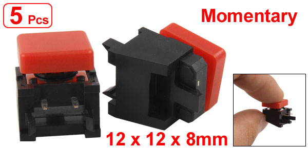 Product Name Tactile Switch Action Type Momentary Switch Size 12 x 12 x 8mm / 0.47" x 0.47" x 0.3" (L*W*H) Overall Size 19 x 13 x 14mm / 0.7" x 0.5" x 0.55"(L*W*H) Cap Size 12 x 12mm / 0.47" x 0.47"(L * W) Pin Pitch 5mm / 0.19" Pin Length 4mm / 0.16" Material Plastic, Metal, Electric Parts Main Color Black, Red Net Weight 9g Package Content 5 x Momentary Tactile Switch - Reviews