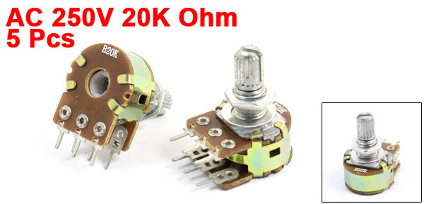 Details5 Pcs 20K Ohm Knurled Shaft Top Dual Linear Potentiometers AC 250V  Product Name Potentiometer Resistance Value 20K ohm Power AC 250V Adjustment Type Adjustment Top Type Dual Linear(Type B) Features Knurled Shaft Shaft Diameter 6mm / 0.2" Shaft Length 8mm / 0.31" Mounting Thread Diameter 6.6mm / 0.26" Base Size 16 x10mm / 0.63" x 0.39"(D*H) Total Height 27mm/1.06" Material Metal, Electronic Parts,Carbon Film Net Weight 37g Package 5 x Potentiometer