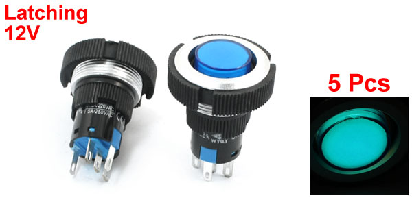 Item Name Push Button Switch Action Type Latching Type Contact SPDT(1NO 1NC) Switch Rating AC 220V 5A Lamp Voltage 12V Lamp Color Blue Pin Number 5 Thread Diameter 22mm/0.87'' Total Size(Not Included Pin) 29 x 32mm/1.2'' x 1.3'' (L*Max.W) Material Plastic, Electric Parts Housing Color Black, Blue Net Weight 57g Package Content 5Pcs x Push Button Switch - Reviews