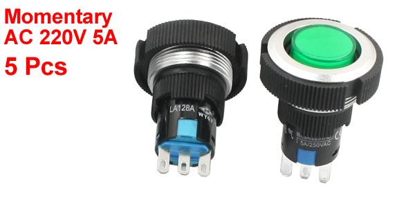 5 Pcs 22mm SPDT 1NO 1NC Momentary Green Plastic Push Button Switch AC220V 5A