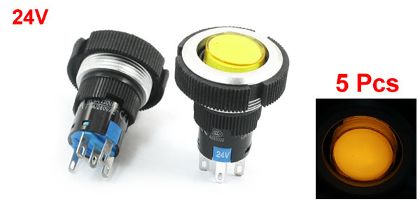 5 Pcs 24V 22mm Panel Mounting SPDT 5Pin Locking Yellow Lamp Push Button Switch