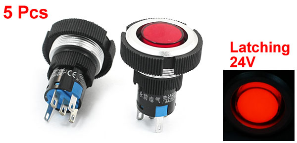 Item Name Push Button Switch Action Type Latching Type Contact SPDT(1NO 1NC) Switch Rating AC 220V 5A Lamp Voltage 24V Lamp Color Red Pin Number 5 Thread Diameter 22mm/0.87'' Total Size(Not Included Pin) 29 x 32mm/1.2'' x 1.3'' (L*Max.W) Material Plastic, Electric Parts Housing Color Black, Red Net Weight 60g Package Content 5Pcs x Push Button Switch - Reviews