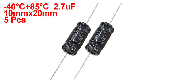 Product Name Electrolytic Capacitor Type Axial Lead Features Standard General Purpose Maximum Temperature -40°+85°C Withstand Voltage 100V Capacitance 2.7uF Body Size 10 x 20mm / 0.4"x 0.8"(D*L) Lead Length 25mm/ 0.98", 20mm/ 0.78" Dielectric Material Aluminum Weight 13g Color As Picture Shown Package Content 5 Pcs x Electrolytic Capacitors - Reviews