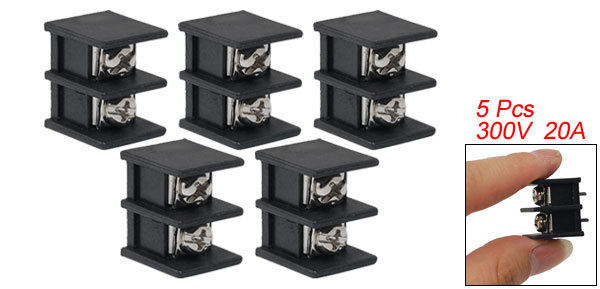 Product Name Screw Terminal Block Material Plastic, Metal Rated Value 300V, 20A Poles 2P Pin Distance 9.5mm/0.37'' Total Size 20 x 15 x 23mm/0.8'' x0.6'' x 0.9'' (L*W*H) Color Black Weight 36g Package Content 5 x 2P Screw Terminal Block - Reviews