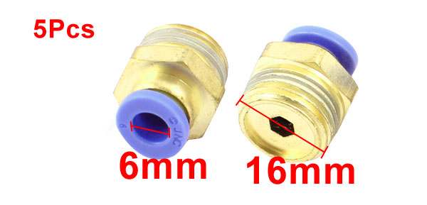 Item Name Quick Fittings Model JPC6-03 Material Metal, Plastic Color Gold Tone, Blue Thread Size 3/8" PT Thread Diameter 16mm Inner Diameter(Blue End) 6mm Total Size(Each) 21 x 19mm/ 0.8" x 0.7" (L*W) Weight 80 Package Content 5 x Quick Fittings - Reviews