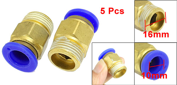 Item Name Quick Fittings Material Solid Brass & Plastic Color Gold Tone, Blue Thread Size 3/8" PT Thread Diameter 16mm Inner Diameter (Blue End) 10mm/ 0.394" Total Size(Each) 26 x 12mm/ 1.02" x 0.47" (L*Max. D) Weight 77g Package Content 5 x Quick Fittings - Reviews