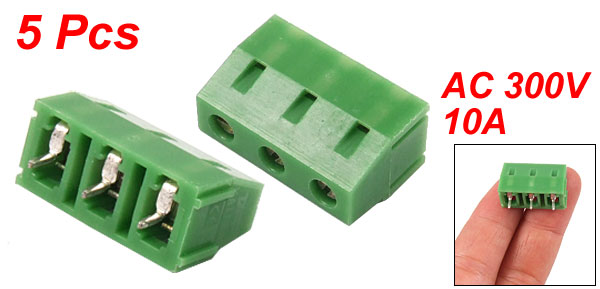 Product Name Screw Terminal Block Material Plastic Rated Value AC 300V, 10A Pin Number 3 Pitch 7mm Total Size 22 x 10 x 17mm/0.87" x 0.39" x 0.67" (L*W*H) Color Green Weight 21g Package Content 5 x 3P Screw Teminal Blocks  - Reviews