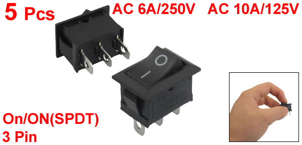 Item Name Rocker Switch Type On/ON(SPDT) Terminals 3 Pin Voltage & Current AC 6A/250V, AC 10A/125V Overall Size ~21 x 15 x 25cm / 0.8" x 0.6" x 1"(L*W*T) Mounting Hole Size 19 x 12mm / 0.75" x 0.47"(L*W) Color Black Material Plastic & Metal Total Net Weight 19g Package Content 5 x Rocker Switch - Reviews
