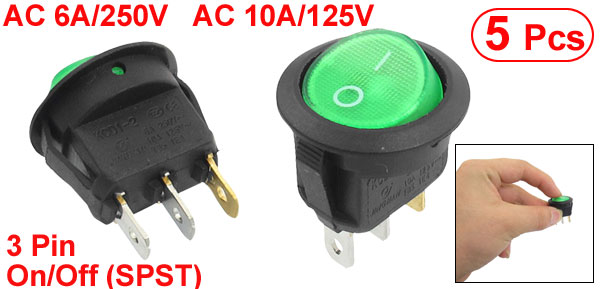 5 Pcs 3 Pin SPST Green Neon Light On/Off Round Rocker Switch AC 6A/250V 10A/125V