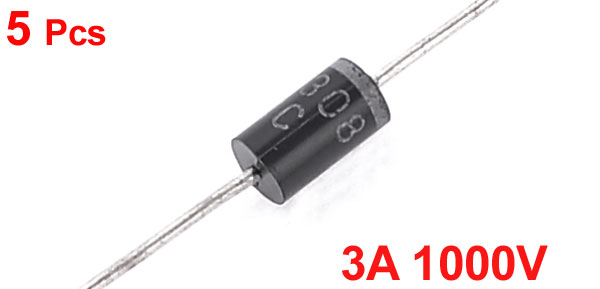Product Name Rectifier Diode Current 3A Max Peak Reverse Voltage 1000V Lead Diameter 1mm / 0.04" Body Dimension 9 x 5mm / 0.35" x 0.2" (H*D) Total Length (Each) 57mm / 2.2" Color Silver Tone, Black Weight 9g Package Content 5 Pcs x Rectifier Diode - Reviews