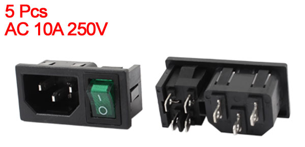 Product Name Power Socket Plug Type IEC320 C14 Voltage & Current AC 10A 250V Rocker Switch Type 2 Position; 4Pin; DPST Light Color Green Overal Size 4.9 x 2.4 x 2.9cm/1.9" x 0.9" x 1.1"(L*W*T) Mount Size 4.6 x 2.1cm/1.8" x 0.8"(L*W) Material (External) Plastic, Metal Main Color Black Weight 64g Package Content 5 x Power Socket