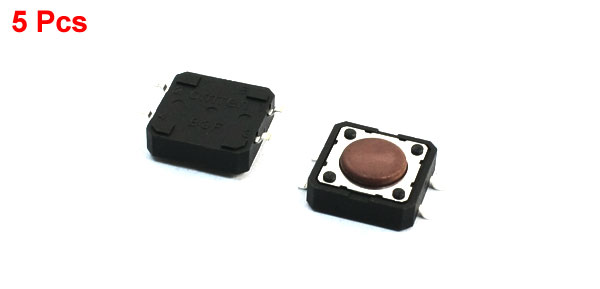 Product Name Tact Push Button Switch Contact Type Momentary Total Size(Pin Not Include) 12 x 12 x 4.3mm/0.5" x 0.5" x 0.17"(L*W*T) Button Diameter 7mm/0.28" Material Plastic, Metal, Brown Color Black, Silver Tone Net Weight 5g Package Content 5 Pcs x Tact Push Button Switches - Reviews