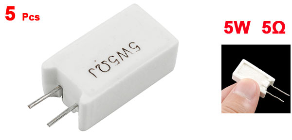 Product Name Cement Resistor Body Material Ceramic, Cement Power 5W Resistance 5 Ohm Tolerance ±5% Body Size (Approx.) 25 x 13 x 9mm/1'' x 0.5'' x 0.35'' (L * W * H) Pin Size (Approx.) 11 x 0.7mm / 0.43'' x 0.03"(L*D) Pin Spacing 5mm/0.2'' Color White Weight 33g Package Content 5 x Cement Resistors - Reviews