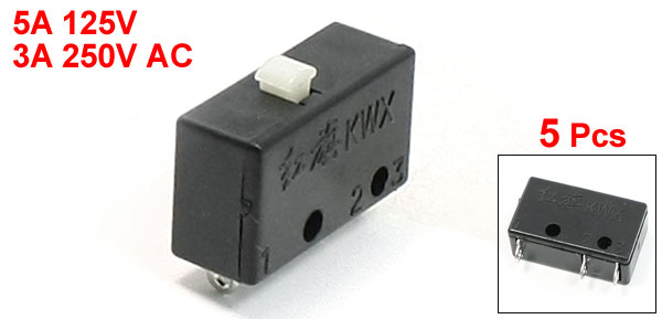 Product Name Micro Switch Actuator Type Push Button Rated Load 5A 125V, 3A 250V AC Switch Body Size(Each) 2 x 1 x 0.5cm/0.78" x 0.4" x 0.2" (L*W*H) Holes Dia. 0.14cm / 0.055" (Approx) Button Size 0.3 x 0.2cm/0.118" x 0.079"(W*H) Material Plastic, Metal Color Black, White Silver Tone Net Weight 9g Package Content 5 x Micro Switch - Reviews