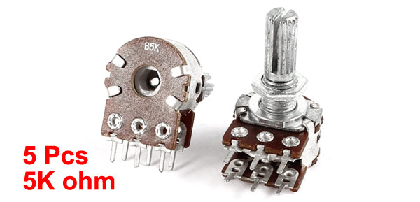 Product Name Potentiometer Resistance Value 5K ohm Power AC 220V 6A Adjustment Type Top Adjustment Type Dual Linear(Type B) Features Knurled Shaft Shaft Diameter 6mm / 0.2" Shaft Length 13mm / 0.55" Mounting Thread Diameter 6.6mm / 0.26" Base Size 16 x10mm / 0.63" x 0.39"(D*H) Total Height 31mm/1.1" Material Metal, Electronic Parts,Carbon Film Net Weight 42g Package 5 x Potentiometer - Reviews