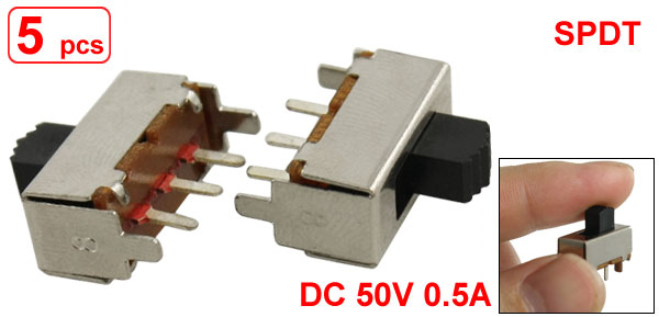 Details5 Pcs 5mm High Knob 3 Pin 2 Position 1P2T SPDT Vertical Slide Switch 0.5A 50V DC  Product Name Slide Switch Model No. SS12F03 Type SPDT Pins Quantity 3 Contact Type 2 Positions, On/On Rating DC 50V, 0.5A Contacts Resistance 30MΩ Insulation Resistance 100MΩ Minimum Load DC 500V Dielectric Strengths AC 500V / 1 minute Life Test 10000 cycles/ minute Main Body Size(not include Pins & Knob) 17 x 7.5 x 7mm/ 0.67" x 0.29" x 0.27" (L*W*H) Overall Size 17 x 7.5 x 17mm/ 0.67" x 0.29" x 0.67" (L*W*H) Pin Size 5 x 1mm/ 0.2" x 0.04" (L*W) Pin Pitch 4mm/ 0.157" Knob Size 5.4 x 3.6 x 5mm/ 0.21" x 0.14" x 0.2" (L*W*H) Material Plastic, Metal, Electronic Parts Color Silver Tone, Black Weight 10g Package 5 x Slide Switch