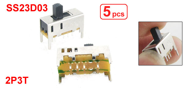 Life Test 10000 cycles/ minute Knob Size 3 x 2.5 x 5mm / 0.12" x 0.1" x 0.19"(L * W* H) Pin Pitch 2.54mm / 1" & 5mm / 0.2" Main Body Size(not include Pins & Knob) 16 x 7 x 6.5mm / 0.6" x 0.27" x 0.25"(L * W* H) Overall Size 16 x 7 x 15mm / 0.6" x 0.27" x 0.6"(L * W* H) Material Plastic & Metal Color As picture shown Weight 7g Package 5 x Slide Switch - Reviews