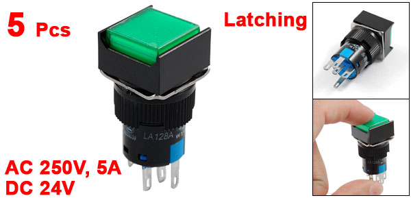 Item Name Push Button Switch Type Latching, 1NO 1NC Switching Voltage AC 250V, 5A Light Voltage DC 24V Light Color Green Button Size 15 x 15mm/0.6'' x 0.6''(L*W) Thread Diameter 15.6mm/0.61'' Size 17 x 17 x 40mm/0.7'' x 0.7'' x 1.5''(L*W*H) Material Plastic, Metal Weight 37g Package Content 5 x Push Button Switch - Reviews
