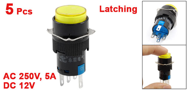 5 Pcs 5P Latching 1NO 1NC Yellow Neon Light Round Push Button Switch DC 12V