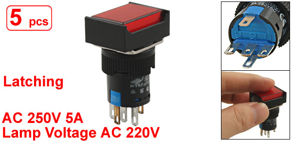 5 Pcs 5P Red Lamp 1NO 1NC Latching Rectangular Push Button Switch AC 220V