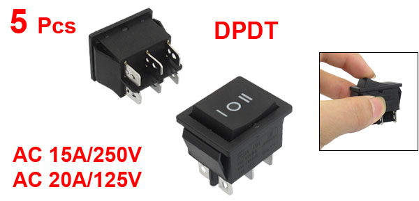 Details5 Pcs 6 Pin DPDT Black Button On/Off/On Rocker Switch AC 250V/15A 125V/20A  Item Name Rocker Switch Type On/Off/On (DPDT) Terminals 6 Pin Voltage & Current AC 15A/250V, AC 20A/125V Overall Size ~31 x 26 x 33mm / 1.2" x 1" x .3"(L*W*T) Mounting Hole Size 27.1 x 21.4mm / 1.1" x 0.8"(L*W) Color Black Material Plastic & Metal Total Net Weight 66g Package Content 5 x Rocker Switch