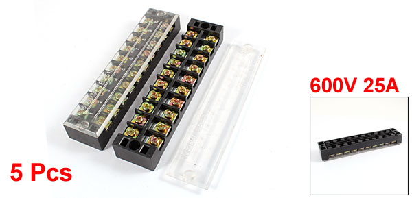 5 Pcs 600V 25A 10 Positions 10P Dual Rows Covered Barrier Screw Terminal Block