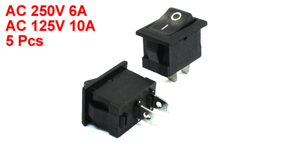 Details5 Pcs 6A 250VAC 10A 125VAC SPST ON/OFF 2 Position Black Snap in Rocker Switch  Product Name Rocker Switch Poles SPST Terminals 2 Pins Position On/Off Two Position Rated Voltage & Current 6A 250VAC 10A 125VAC Button Color Black Overall Size 21 x 15 x 25mm/0.8" x 0.59" x 1"(L*W*T) Mounting Size 19 x 12mm/0.75" x 0.47"(L*W) Color Black, Silver Tone Material Plastic, Metal Total Weight 17g Package Content 5 Pcs x Rocker Switch