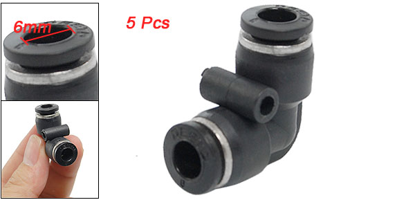 Product Name Quick Fittings Type 6mm to 6mm ( L Shaped) Material Plastic One Touch End Diameter 6mm/ 0.23" Dimension (Approx) 2.6 x 2.6 x 1.2cm/ 1" x 1" x 0.5" (L*W*H) Color Black, Silver Tone Weight 29g Package Content 5 x Pneumatic Quick Fittings - Reviews