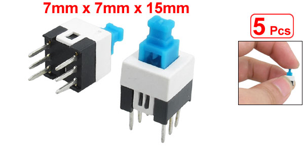 Product Name Tact Switch Contact Type Self Locking Contact Dimension 7 x 7mm / 0.28" x 0.28" (L*W) Overall Height 15mm / 0.6'' Pin Pitch 5 x 2mm / 0.2" x 0.08'' (L*W) Pin Length 4mm/0.16'' Material Plastic, Metal, Electric Parts Color Black, Blue, White Net Weight 3g Package Content 5 x Tact Switch - Reviews