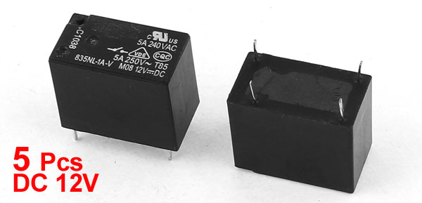 Product Name Power Relay Model No. 835NL-1A-V Rating Current 1A Max. Contact Current 5A Coil Voltage DC 12V Rated Load 5A 240VAC 5A 250VAC Size 1.8 x 1 x 1.8cm/0.7" x 0.39" x 0.7"(L*W*H) Material Plastic , Metal Color Black