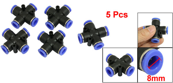 Product Name Pneumatic Quick Fitting Connector Type 8mm to 8mm (Cross Shaped) Material Plastic Size (Approx) 46 x 46 x 16cm / 1.7" x 1.7" x 0.63" (L*W*H) Color Black, Blue Weight 52g Package Content 5 x Pneumatic Quick Fitting - Reviews