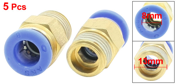 Item Name Quick Fittings Material Solid Brass, Plastic Color Gold Tone, Blue Thread Size 1/4" PT Thread Diameter 13mm Inner Diameter (Blue End) 8mm/ 0.31" Total Size(Each) 23 x 14mm/ 0.9" x 0.55" (L*Max. D) Weight 45g Package Content 5 x Quick Fittings - Reviews