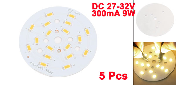 Product Name LED Aluminum Base Light Type LED LED Type SMD 5730 Light Color Warm White Light Quantity 18 Luminous 80lm/w Color Temperature 3500K Power 9W Voltage DC 27-32V Current 300mA Material Electronic Parts, Aluminum Base Diameter 65mm/2" Net Weight 62g Package Content 5 x LED Aluminum Base - Reviews