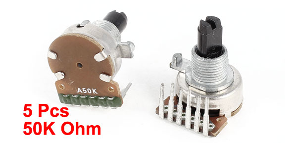 Product Name Potentiometer Resistance Value 50K ohm Adjustment Type Top Adjustment Type Single Linear (Type A) Features Knurled Shaft Shaft Diameter 6mm / 0.23" Shaft Length 15mm / 0.6" Thread Hole Dia 9mm / 0.35" Base Height 8mm / 0.31" Base Diameter 16mm / 0.62" Material Metal,Electronic Parts Color Silver Tone,Bronze Tone Weight 26g Package 5 x Potentiometers - Reviews