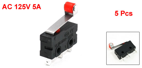 Product Name Micro Switch Voltage & Current AC 125V 5A Contact Type SPDT 1NO 1NC 1COM Action Type Momentary Actuator Type Hinge Roller Lever Terminal Type 3 Pins Overall Size(Pin not included) 20 x 6 x 10mm / 0.8" x 0.2" x 0.4" (L*W*H) Hinge Roller Lever Length 18mm/0.7" Roller Diameter 4.5mm/0.2" Mounting Hole Dia. 2mm / 0.08" Mounting Hole Spacing 9mm/ 0.35" Material Plastic, Metal Color Black, Red, Silver Tone Net Weight 11g Package Content 5 x Micro Switch - Reviews