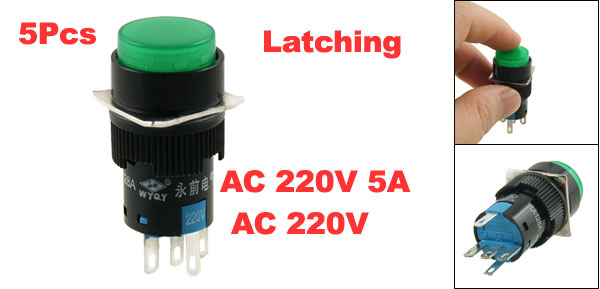 Item Name Push Button Switch Contact Type 1NO, 1NC Switch Type Latching Type Switch Working Voltage AC 250V, 5A Lamp Voltage AC 220V Thermal Current(Ith) AC 220V 5A Lamp Cap Color Green Switch Color Black, Green Pin Number 5 Button Cap Diameter 15mm/ 0.59" Mounting Thread Dia. 16mm/ 0.63" Total Size 18 x 18 x 41mm/ 0.71" x 0.71" x 1.6"(L*W*H) Material Plastic, Electronic Parts Weight 37g Package Content 5 x Push Button Switch - Reviews