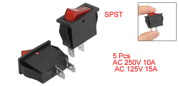 Product Name Rocker Switch Poles SPST Terminals 2 Pin (On - Off) Rating Voltage AC 250V 10A, AC 125V 15A Total Size(Each One) 3.1 x 1.4 x 2.8cm/ 1.2" x 0.6" x 1.1"(L*W*H) Mount Hole Size 26 x 10mm/ 1" x 0.39"(L*W) Pin Size 10 x 6mm/ 0.39" x 0.24"(L*W) Color Black, Red Material Plastic, Metal Total Weight 32g Package Content 5 Pcs x Rocker Switch - Reviews