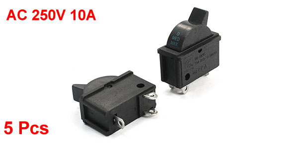 Product Name Rocker Switch for Hair Dryer Contact Type SPDT(1NO 1NC) Terminal Quantity 3 Pins Position 3 Voltage/ Current AC 250V 10A Tempareture 85/55C Panel Size 29 x 12mm/1.1" x 0.47"(L*W) Total Size 3 x 1.4 x 3.1cm/1.2" x 0.57" x 1.2"(L*W*H) Material(External) Plastic, Metal Main Color Black, Silver Tone Weight 36g Package Content 5Pcs x Rocker Switch - Reviews