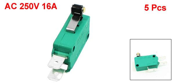 5 Pcs AC 250V 16A SPDT 3 Pins Short Hinge Roller Lever Limit Micro Switch Green