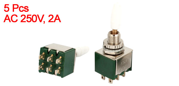 Action Type Latching Pin Number 6 Pins Position 2 Positions (ON/ON) Type DPDT Thread Diameter 6mm / 0.24" Body Size (Approx.) 13 x 12 x 10mm / 0.51" x 0.47" x 0.4" (L*W*T) Total Height 35mm / 1.4" Material Plastic, Metal Color Green, Silver Tone Weight 30g Package Content 5 x Toggle Switch - Reviews