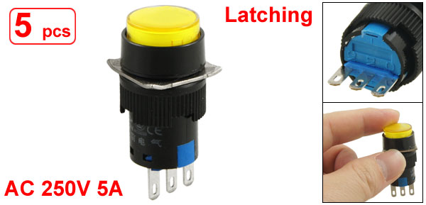 Item Name Push Button Switch Contact Type 1NO, 1NC Switch Type Latching Type Switch Working Voltage AC 250V, 5A Thermal Current(Ith) AC 220V 5A Switch Color Black, Yellow Pin Number 3 Button Cap Diameter 15mm/ 0.59" Mounting Thread Dia. 16mm/ 0.63" Total Size 18 x 18 x 41mm/ 0.71" x 0.71" x 1.6"(L*W*H) Material Plastic, Electronic Parts Weight 32g Package Content 5 x Push Button Switch - Reviews
