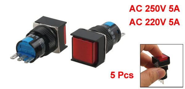 5 Pcs AC 250V 5A Red Square SPDT Self Locking 3P 16mm Push Button Switch
