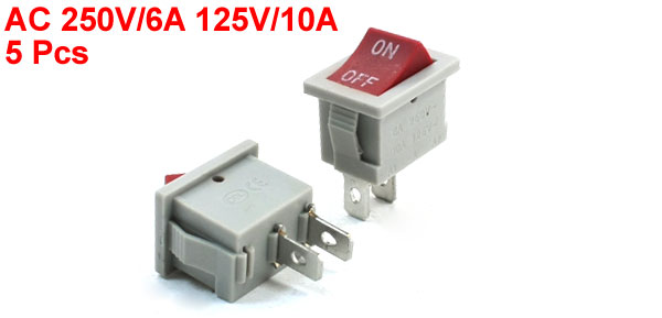 Product Name Rocker Switch Poles SPST Terminals 2 Pins (On-Off) Rating Voltage AC 250V/6A 125V/10A Total Size(Each One) 21 x 15 x 28mm/ 0.83" x 0.59" x 1.1"(L*W*T) Mounting Size 18 x 12mm/ 0.71" x 0.47"(L*W) Color Gray, Red Material Plastic, Metal Weight 19g Package Content 5 x Rocker Switch - Reviews