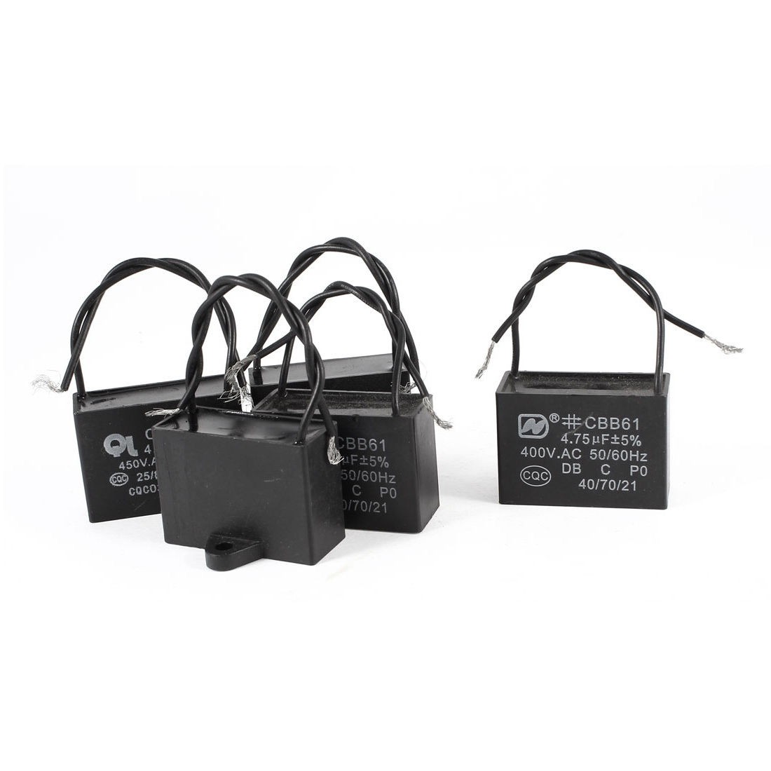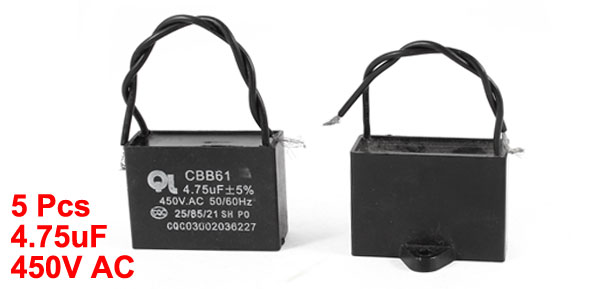 Product Name Motor Run Capacitor Model CBB61 Material Polypropylene Film Rated Capacitance 4.75uF Tolerance 5% Rated Frequency 50/60 Hz Rated Voltage 450V AC Overall Size 47 x 33 x 19mm/ 1.85" x 1.3" x 0.75"(L*W*T) Mount Hole Dia 4.7mm/ 0.185" Wire Length 10mm/ 3.9" Main Color Black Net Weight 178g Package Content 5 x Motor Run Capacitor - Reviews
