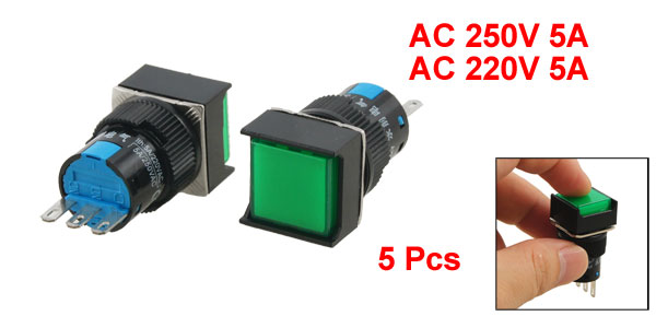 5 Pcs AC 5A 220V 250V SPDT Self Locking Green Square Push Button Switch