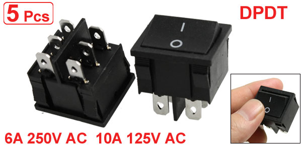 Product Name Rocker Switch Poles DPDT Terminals 6 Pin (On-On) Rating Voltage AC 250V 6A AC 125V 10A Total Size(Each One) 2.4 x 2.1 x 2.5cm / 0.9" x 0.8" x 1"(L*W*T) Mounting Size 2.2 x 1.9 x 2cm/ 0.86" x 0.75" x 0.78"(L*W*T) Color Black Material Plastic, Metal Total Weight 39g Package Content 5 x Rocker Switch - Reviews